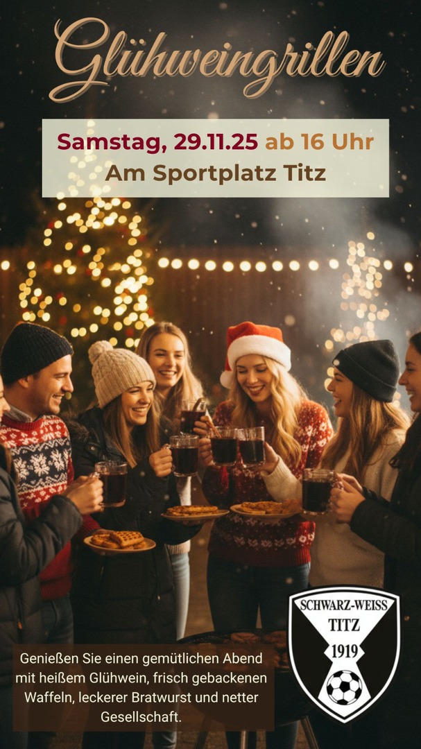 ?✨ Einladung zum Glühweingrillen beim FC Schwarz-Weiß Titz ✨? Die Adventszeit naht – und was könnte sie schöner einläuten als ein gemütliches Beisammensein bei Glühwein, Waffelduft und Lichterglanz? Der FC Schwarz-Weiß Titz lädt alle Bürgerinnen und Bürger herzlich ein zum Glühweingrillen am Samstag, den 29. November 2025, ab 16:00 Uhr am Sportplatz Titz. Freut euch auf frisch gebackene Waffeln, leckere Bratwurst vom Grill und natürlich heißen Glühwein in entspannter, vorweihnachtlicher Atmosphäre. Bei wärmenden Feuerstellen und festlicher Musik wollen wir gemeinsam den Beginn der Adventszeit feiern und ein paar schöne Stunden miteinander verbringen. Ob mit Familie, Freunden oder einfach in geselliger Runde – alle sind herzlich willkommen! Der FC Schwarz-Weiß Titz freut sich auf viele Besucherinnen und Besucher und auf ein stimmungsvolles, herzliches Miteinander. ? Lasst uns gemeinsam anstoßen – auf die Adventszeit, auf Freundschaft und auf ein schönes Miteinander! ?